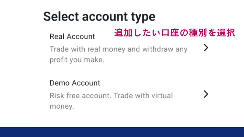 上記のタブで「Real(リアル口座)」「Demo(デモ口座)」のなかから、追加したい口座の種別を選択