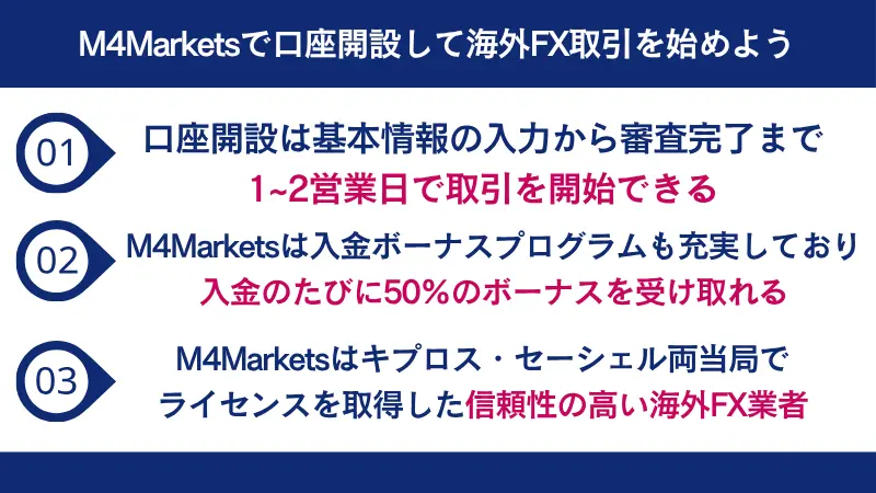M4Marketsが自分に合うか迷っている方へ。当サイト経由なら15,000円ボーナス付きの口座を開設できるので、資金リスクなしで試せます。今すぐM4Marketsで口座開設を行い、自分に最適な取引環境を手に入れましょう。